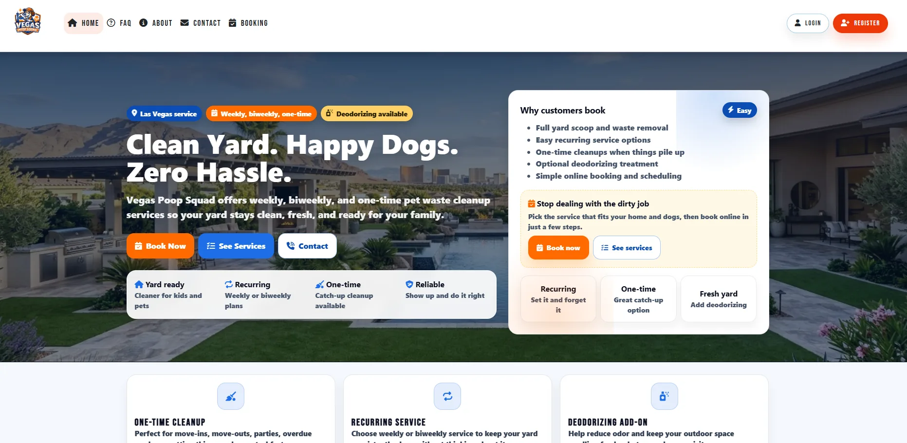 Vegas Poop Squad is a local service company offering poop pickup services for pet owners who want a cleaner yard without the hassle of handling the work themselves. For a business like this, the website needs to do more than explain what the service is. It needs to make the value obvious, build trust quickly, and guide potential customers into a simple booking process that turns interest into recurring revenue. That is exactly what this project was built to do.